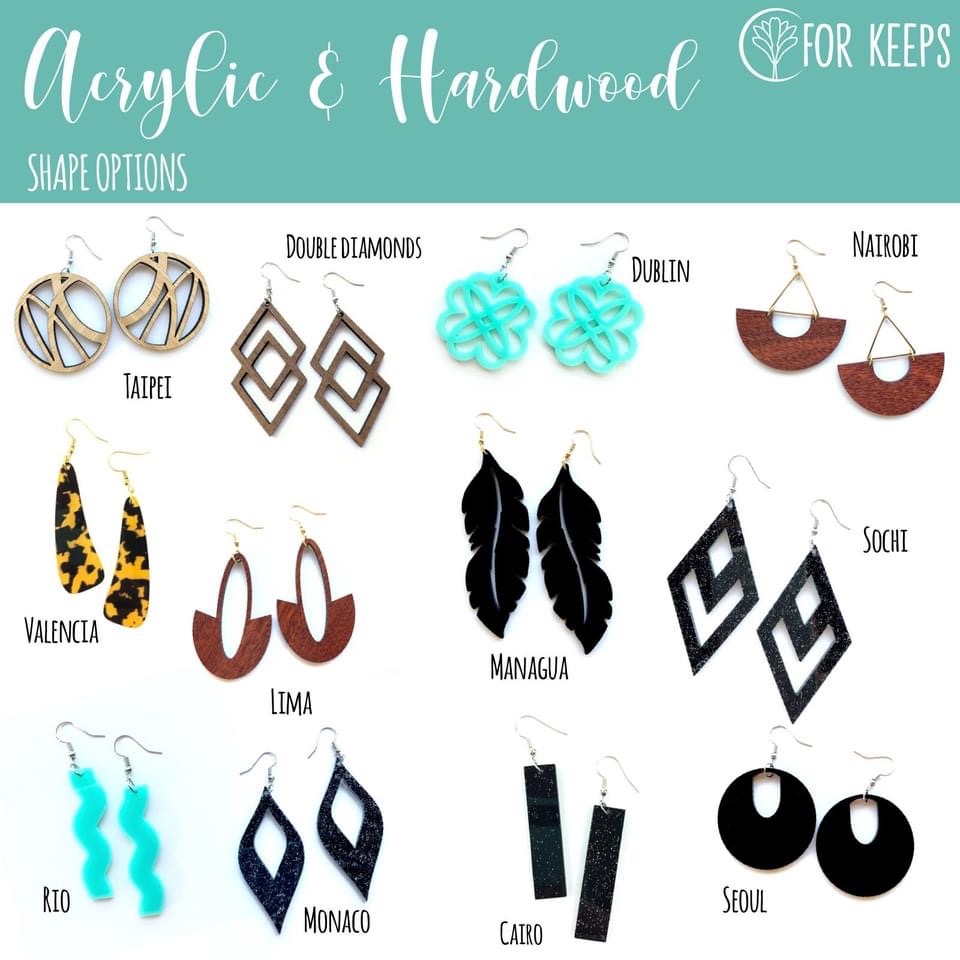 Custom and uniquely designed leather, cork, hardwood, acrylic, and resin earrings and pendants.